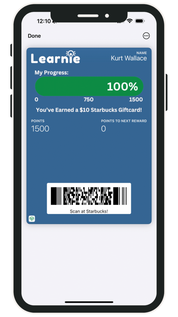 Digital wallet passes simplify the reward process, eliminating traditional barriers like outdated systems or tedious tracking. Once points are earned, participants can conveniently access their rewards through a digital wallet pass stored on their phone. The end user can track their points and redeem them directly on the digital wallet pass, providing an effortless experience that keeps users engaged while reducing operational overhead for organizations leveraging the Learnie platform.